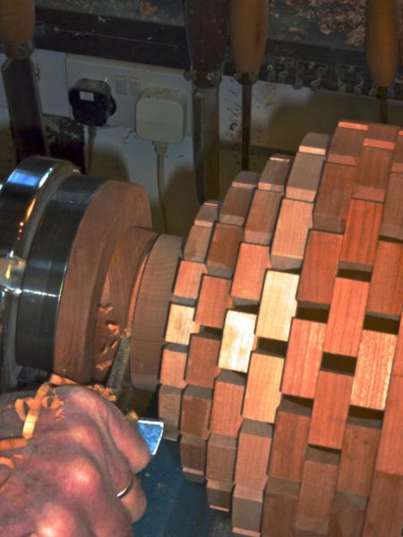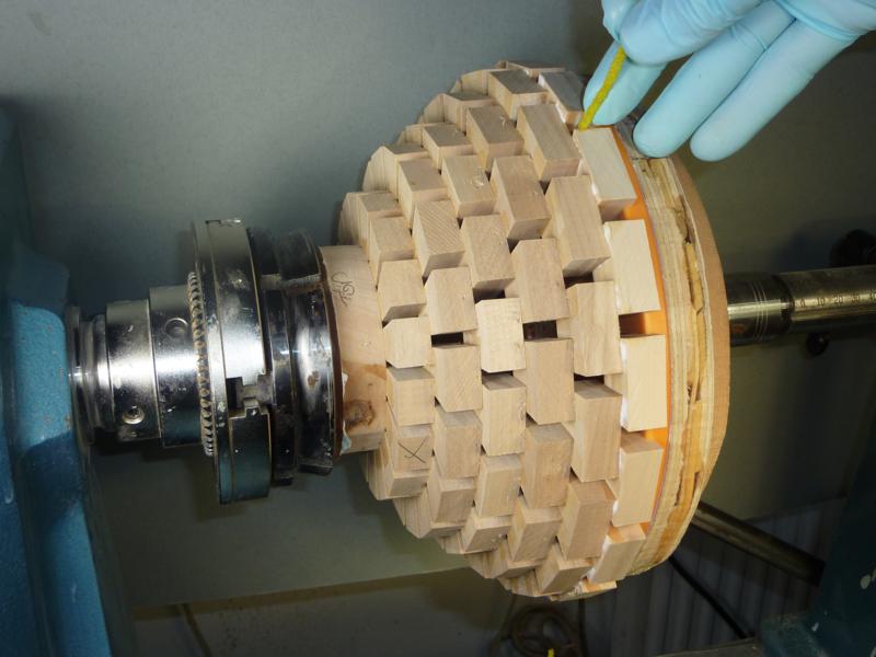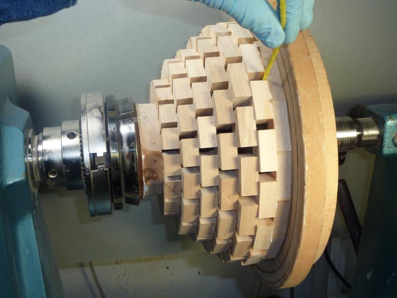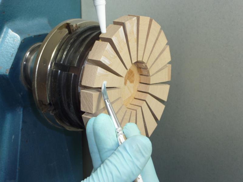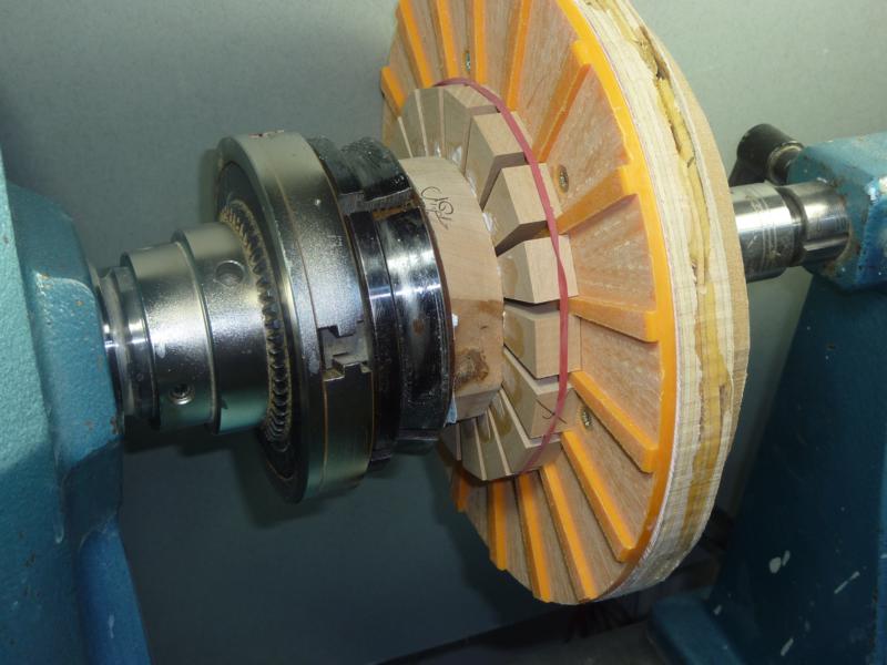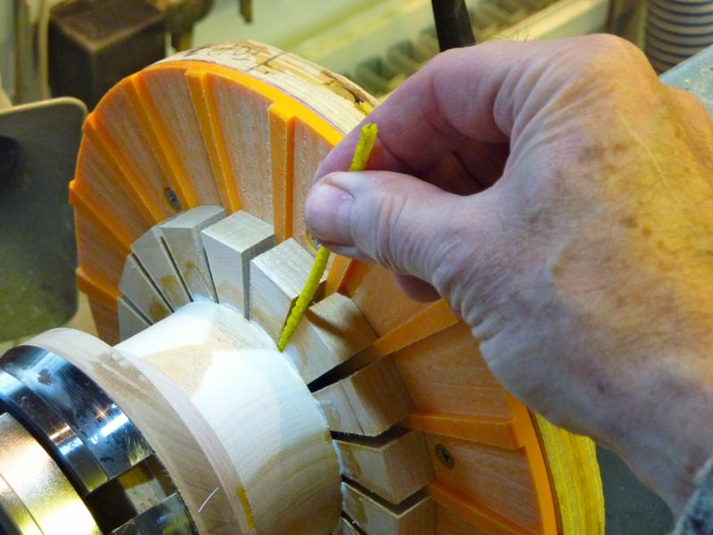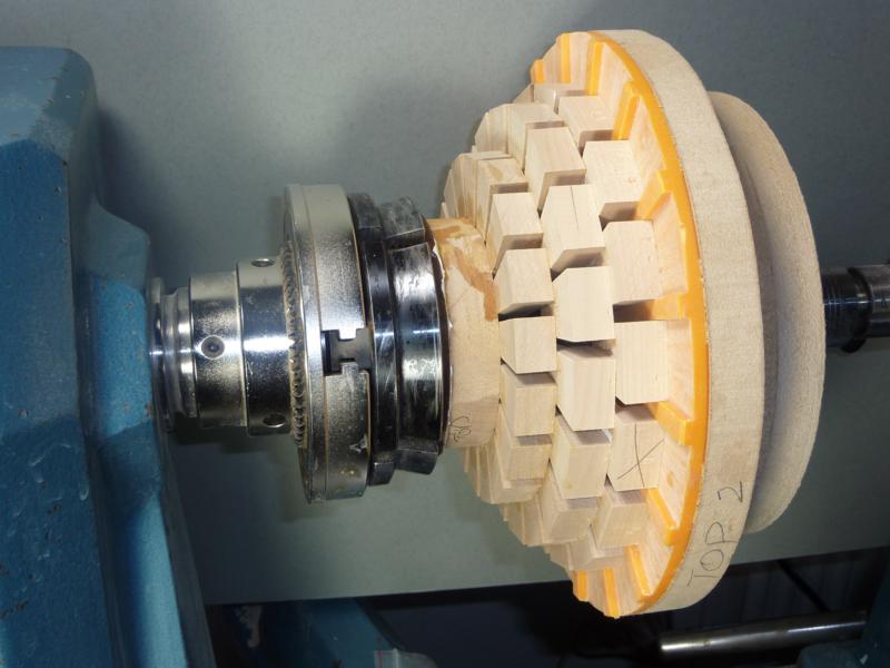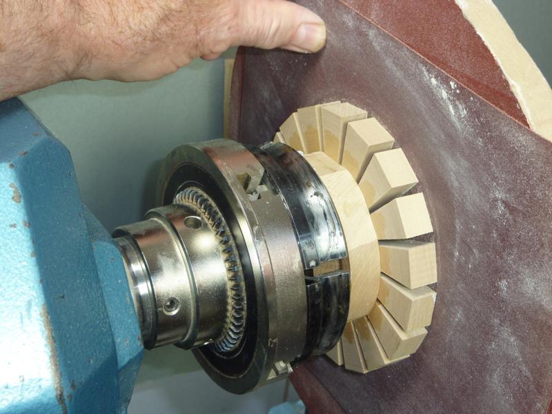 With the lathe running slowly, sand the segments flat.