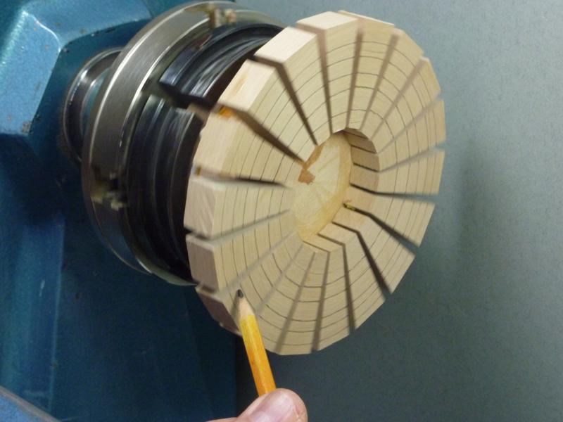 With the lathe runnng slowly, use a pencil to mark the segments for sanding.