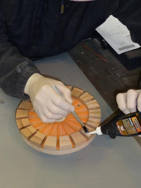 Apply glue to the area of the segments that will touch the block. Tightbond glue works just fine.