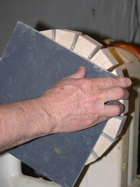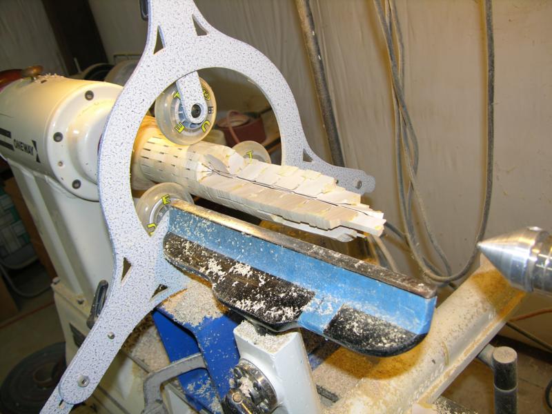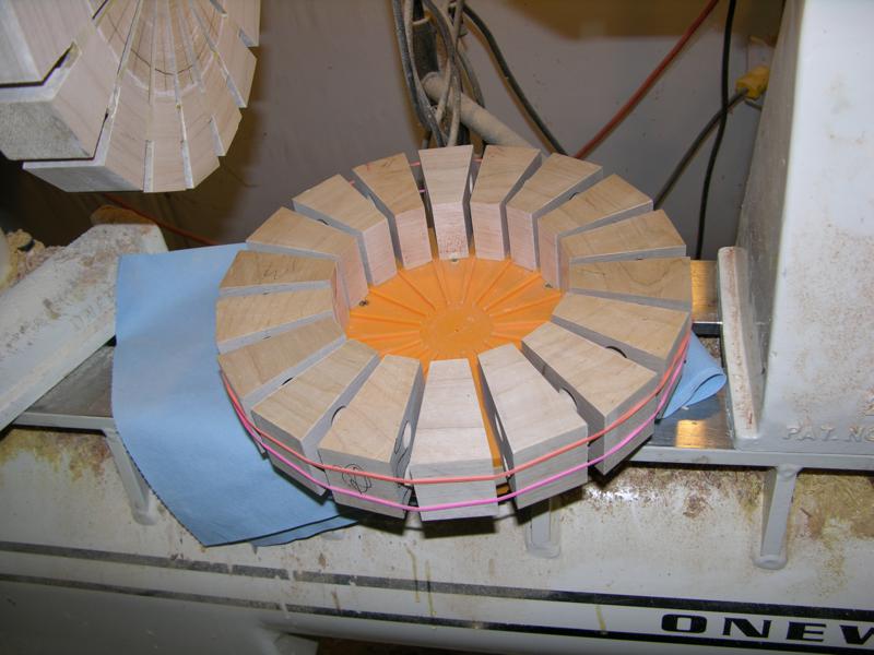 As layers are placed, temporary shims cut at 4 degrees are placed between the segments. They will be cut out later. The shims give the tarball enough strength for turning.