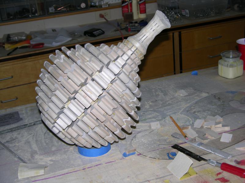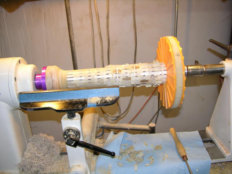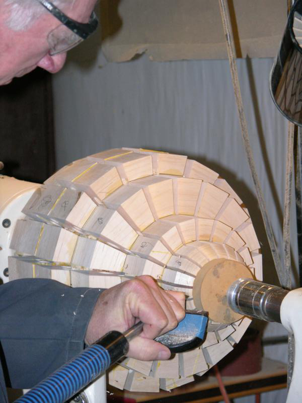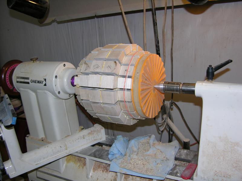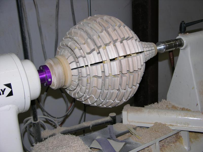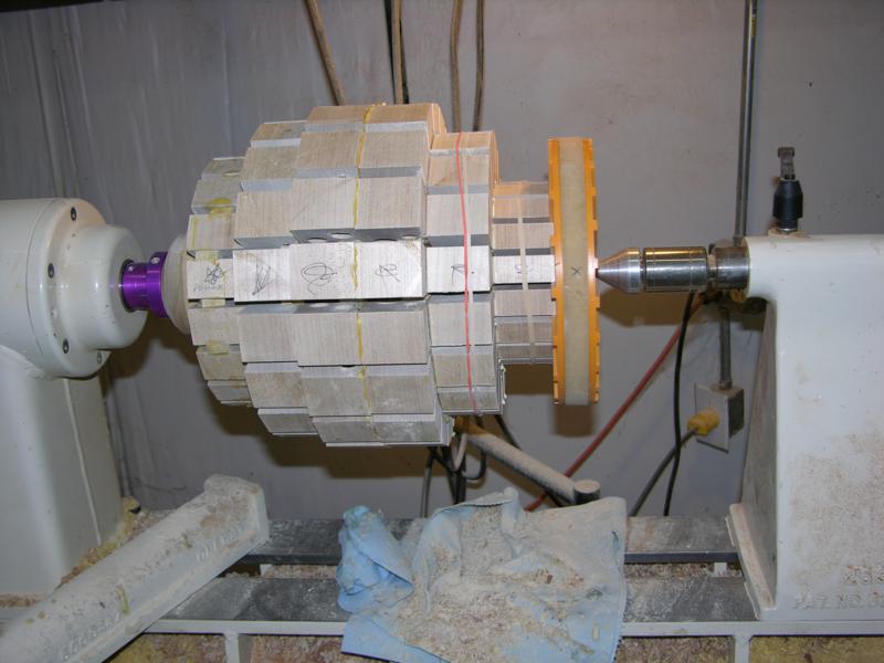Each segment was drilled to match the plan. If glued up precicely, turning into the holes will give a very fluid shape. Without the holes, you are turning blind and accuracy cannot be achieved.