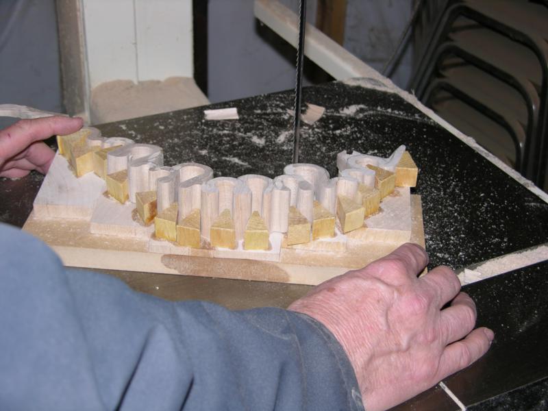Most of the inside is trimmed away with the bandsaw. A simple jig maintained support at the right angle.