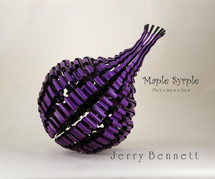 Every once in a while it is fun to do a project that is a little out there. The AAW Invited me to participate in the Maple Medley Exhibition in 2010. I pictured a vessel as fluid as maple syrup. To do it required accurately drilling holes in the segments before assembly. The 18-4 plate was used but only 13 of the strips were included in the final assembly. The piece only had 2 internal rings to hold it together and that was not sufficient. It did not survive shipment.