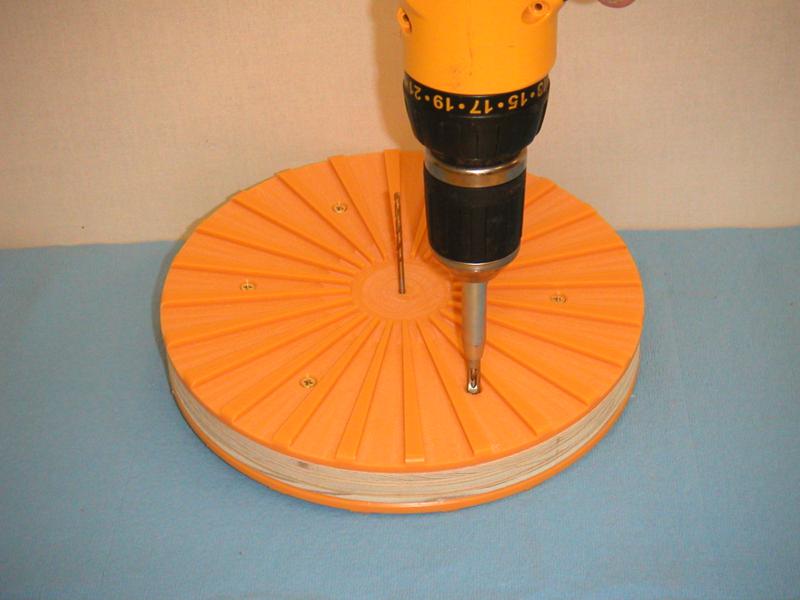 Drill a 1/8” center hole through the MDF disk. This hole must be absolutely perpendicular or alignment errors can occur when gluing the segments. Use the drill bit as a pin to align the SegEasy Plate with the MDF. Drill the holes for the #6 x 3/4” flat-head screws with a self-centering bit and attach. If you have both plates, you can put one on each side of the MDF or plywood using the same procedure.