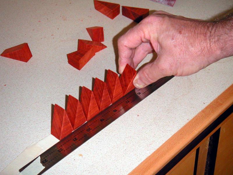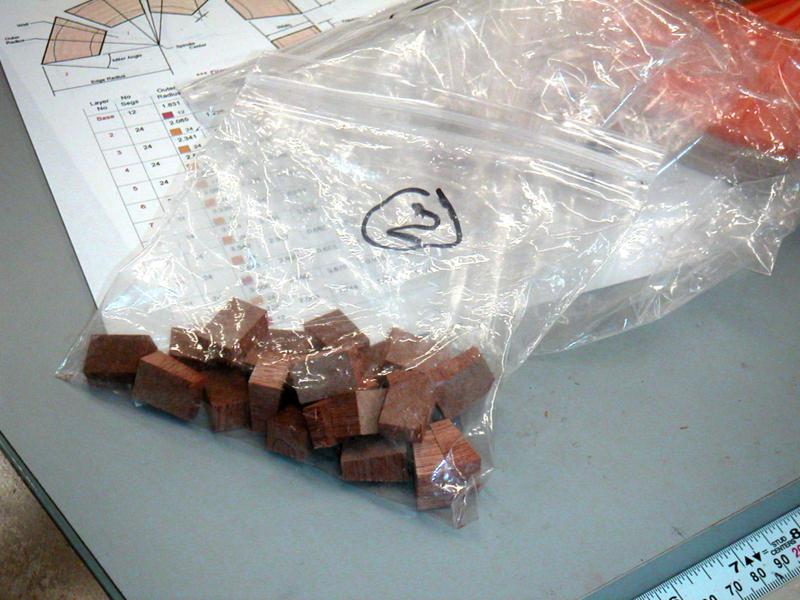 Material preparation is one of the most important tasks. Plane material to the desired thickness and rip into the required strip widths. Be sure to add 3 inches or so in length to keep your fingers a safe distance away from the blade when cutting segments (I have already done this in the chart on the left). If your planer is snipe-prone like mine, just exclude that part of the board. Mark the layer number on the end of each strip. I always cut a couple of extra segments and save the remainder of the strip as insurance in case of a bad segment or two.