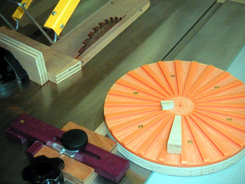 I use a homemade stop that is calibrated to the saw blade to easily set segment widths. An ordinary table saw miter gauge can be used to cut the segments. To calibrate the miter gauge for the open segments, cut a long segment from a piece of scrap, test it in the SegEasy plate and then adjust the miter angle as necessary for a snug fit. Doing it this way, you do not have to worry about the degrees. But if you must know, the angle for the 24-4 plate is 5 1/2 degrees, and 8 degrees for the 18-4 plate. The gap in both plates is 4 degrees. Luckily, the segments do not have to be perfect like they do in a closed-segment layer.