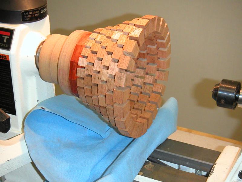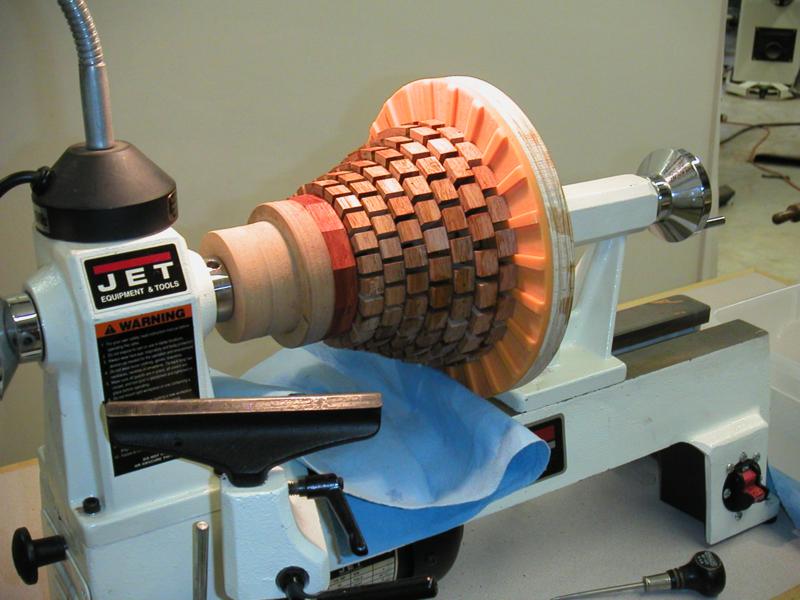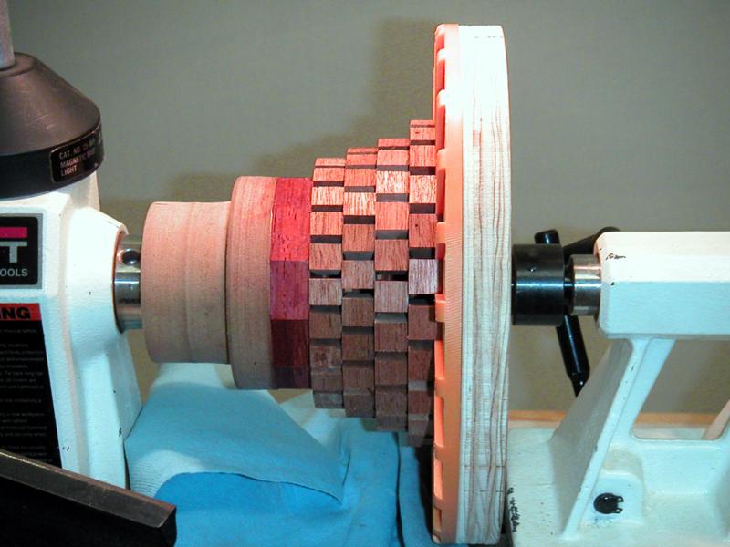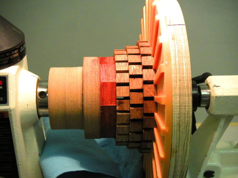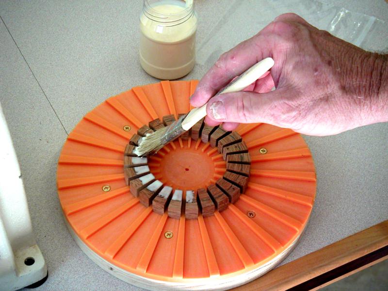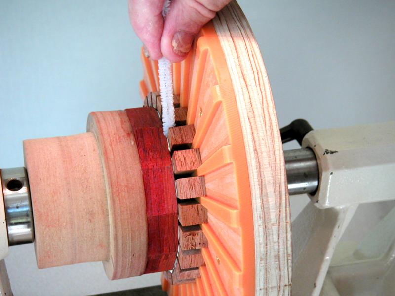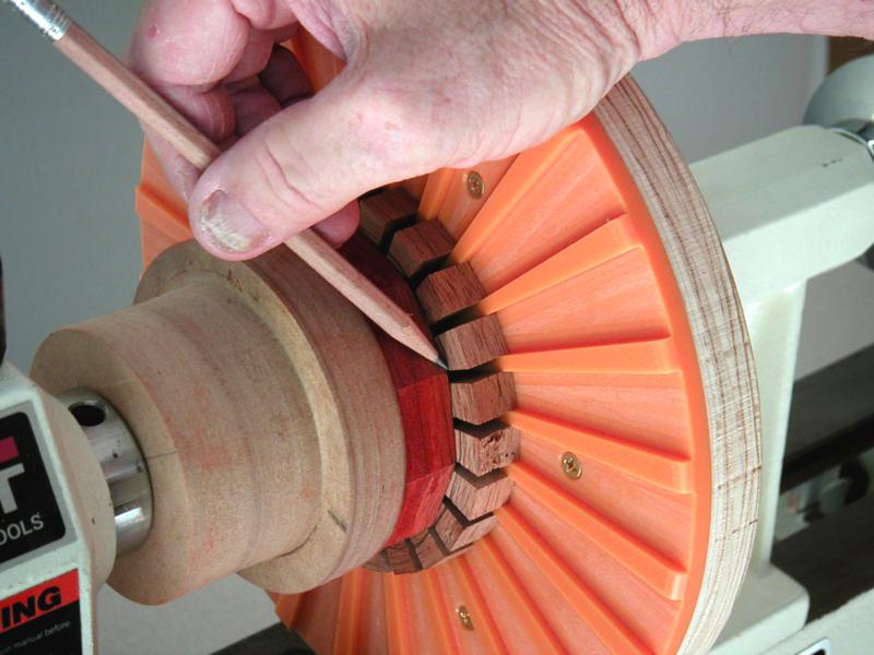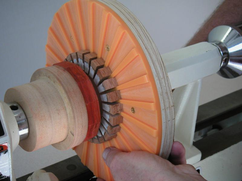 Position plate on tailstock pin and locate segments forward against the base layer.